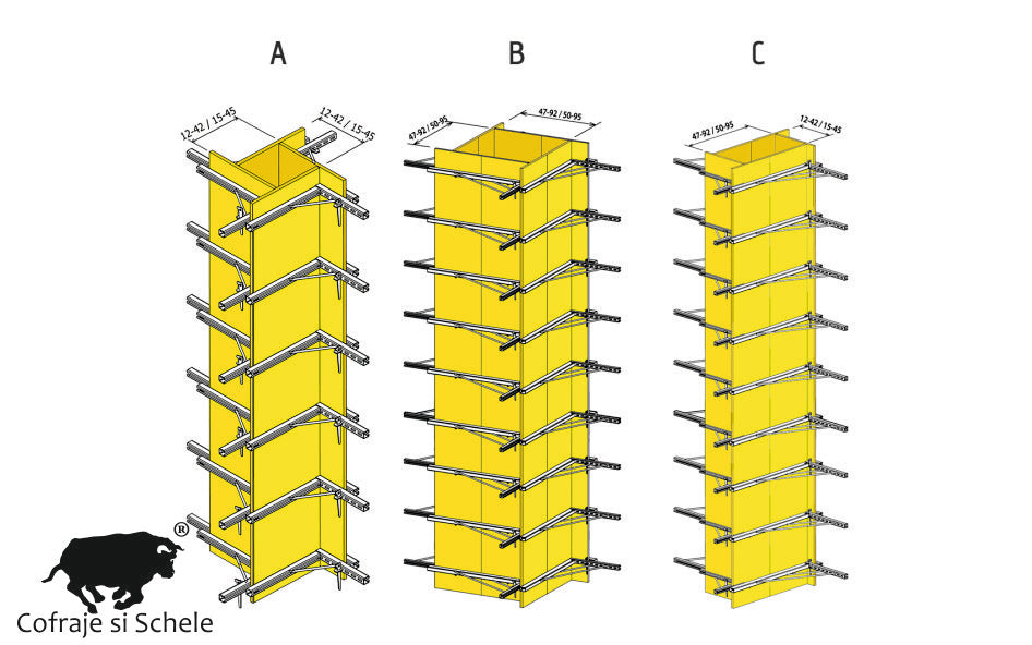 Necesar Recomandat: Pentru un stâlp cu înălțimea de 3 metri, recomandăm utilizarea a 7 seturi complete (adică 28 de elemente individuale tip L), distribuite strategic pe înălțime pentru a contracara forța de turnare a betonului.